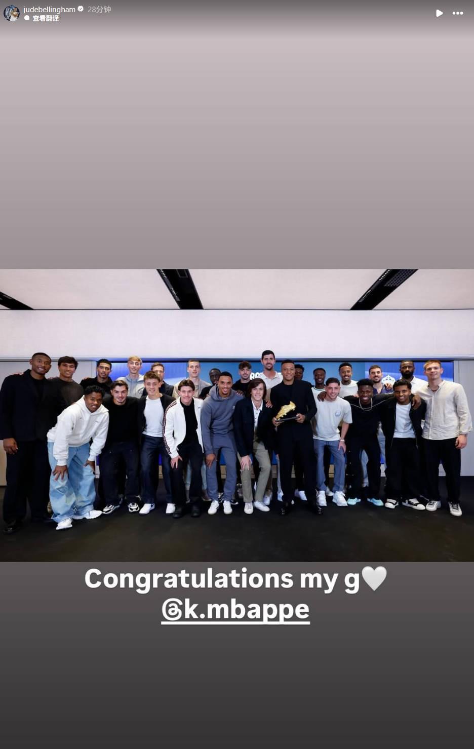 仪式结束后,贝林厄姆在个人社交账号发布动态,晒出皇马全队与姆巴佩的合影,并配文:“恭喜你,兄弟