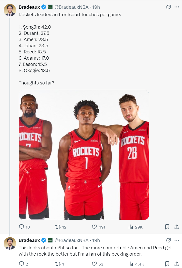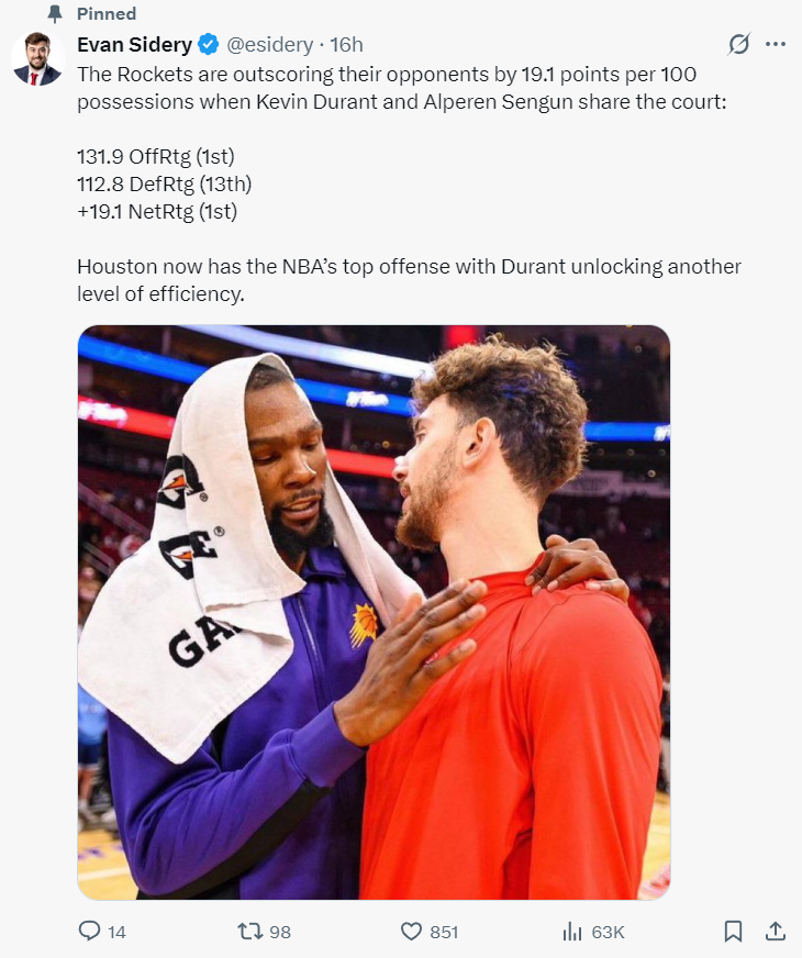 数据印证了申京的核心价值:最近四场比赛他在场时,火箭净胜对手61分(联盟第三),甚至优于约基奇和文班亚马。当申京与杜兰特同场时,火箭每百回合净胜19.1分(进攻效率131.9联盟第一,防守效率112.8联盟第13)。这种"申京依赖症"既成就了球队,也埋下了隐患——约基奇尚有穆雷分担组织压力,而申京却需独自扛起控卫职责。