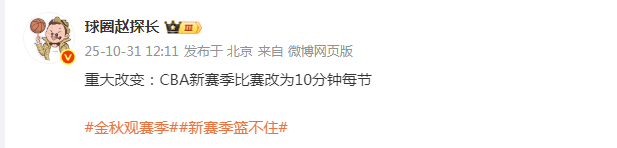 媒体人球圈赵探长率先爆料:“CBA新赛季将采用每节10分钟赛制。”导演我躺哪_basketball进一步补充:“单节时长调整为10分钟,外援制度仍为四节七人次。”这一改革标志着CBA正式向FIBA规则靠拢,此前两个赛季已在裁判判罚尺度上逐步接轨国际标准。