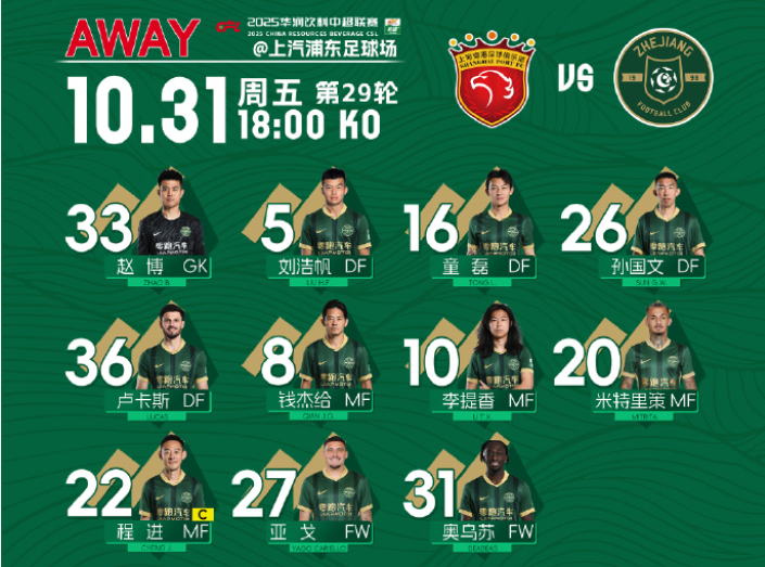 中场:8-钱杰给、10-李提香、20-米特里策(F)、22-程进