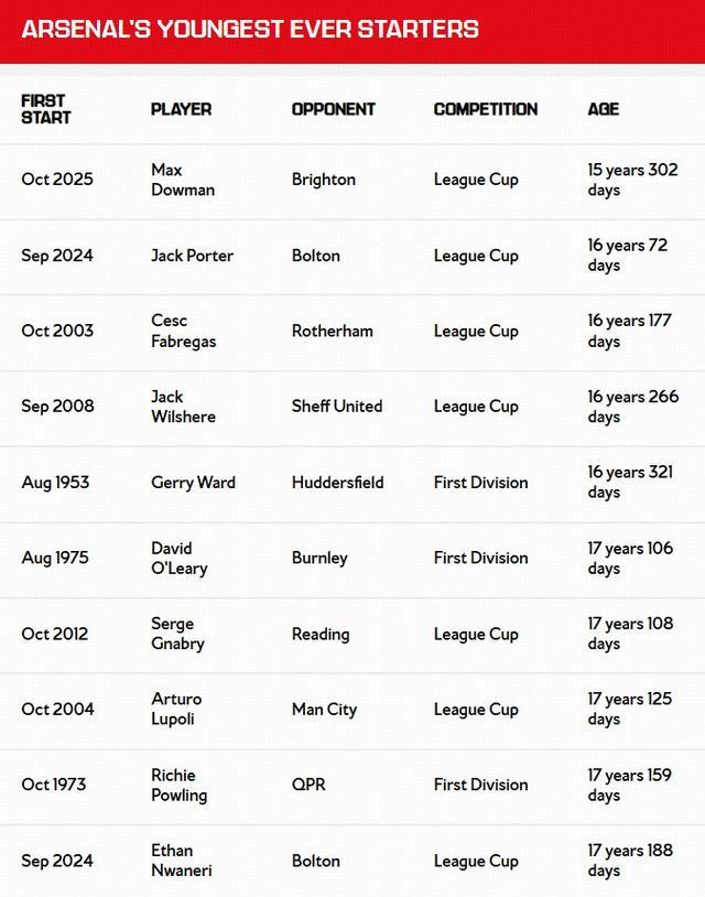 道曼所打破的,是杰克-波特在2024年9月26日创造的纪录。在那场同样是英联杯第3轮的比赛中,阿森纳主场5-1大胜博尔顿流浪者,而杰克-波特作为首发门将打满了全场,当时的他年仅16岁72天。如今,道曼以更年轻的姿态,将这一纪录收入囊中。