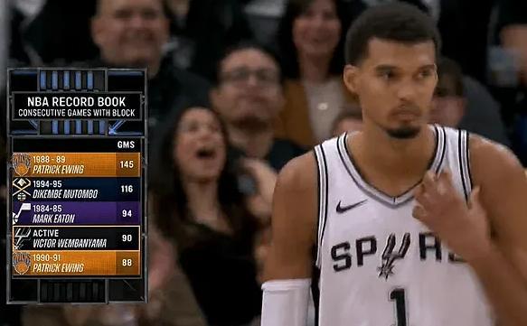 值得关注的是,文班亚马已连续90场比赛送出盖帽,排名历史第四,距离榜首尤因的145场纪录仅差55场。以他当前场均4.8次盖帽的效率,突破历史纪录指日可待。更令人惊叹的是其技术全面性——既能完成飞天大帽,又能送出精妙助攻,甚至开发出稳定的三分投射,这种现代篮球最稀缺的"空间型内线"特质,使其成为对手防线的噩梦。