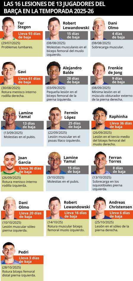 雷速体育10月31日讯 据西班牙权威媒体《世界体育报》最新报道,巴塞罗那足球俱乐部在本赛季遭遇了前所未有的伤病困扰。自新赛季开赛以来,巴萨23名一线队成员中已有13人遭遇不同程度的伤病侵袭,这一数字令人震惊。