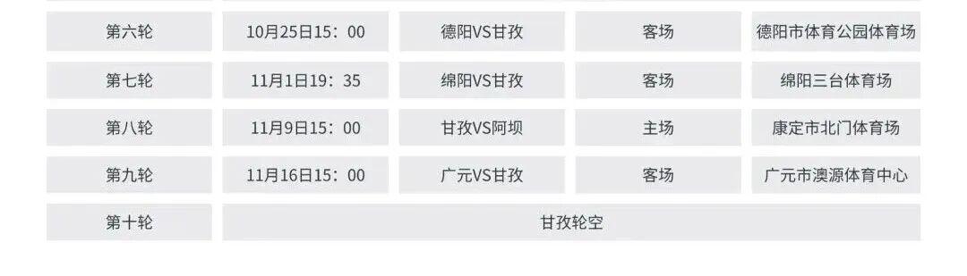根据“川超”赛程安排,11月1日甘孜队将在客场挑战绵阳队,11月9日将在主场迎战阿坝队,11月16日将赴广元挑战。川北赛区甘孜队小组赛赛程如下: