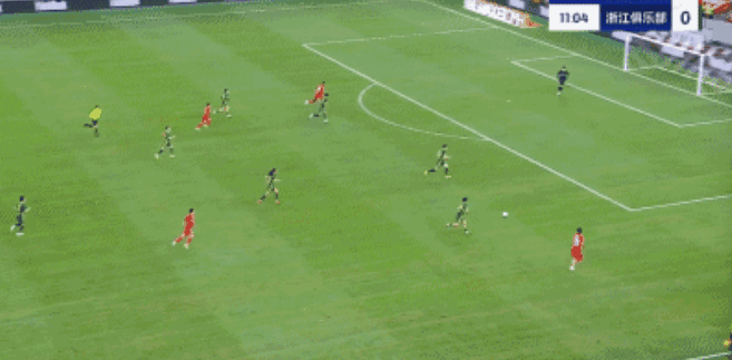 第31分钟,活跃的刘若钒在顶弧附近面对浙江队包夹,顺势转身获得起脚空间,可惜随后的远射击中门柱弹出。半场结束前,茹萨突入浙江禁区后被防守球员撞倒,但主裁判未予判罚。