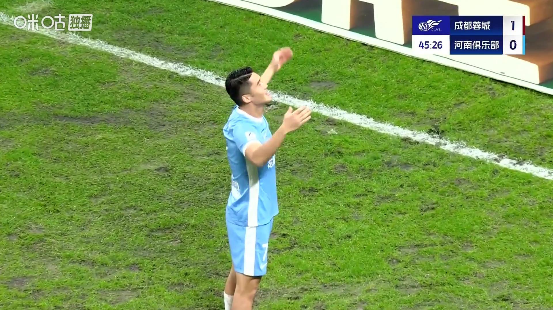 比赛开场第15分钟,成都蓉城迎来绝佳机会,胡荷韬破门但因周缘德手球在先被判无效,主裁判艾堃向周缘德出示黄牌并改判任意球。第20分钟,严鼎皓主罚任意球直接破门,帮助成都蓉城1-0领先。河南队上半场进攻端表现低迷,仅在尾声阶段由纳萨里奥完成一次倒钩射门,但皮球偏出球门。半场战罢,成都蓉城暂时领先。