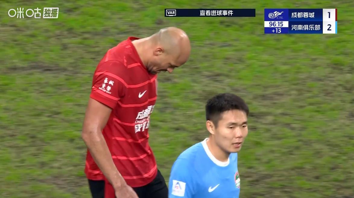 补时阶段,成都蓉城发起最后冲锋,费利佩一度攻入扳平球,但因周定洋越位在先被判无效。最终,成都蓉城1-2不敌河南队,联赛和足协杯双线遭遇对手“三杀”。由于上海海港本轮获胜后积63分,成都蓉城输球后仍积59分,在联赛仅剩1轮的情况下,已无法抹平4分分差,提前1轮退出争冠行列。