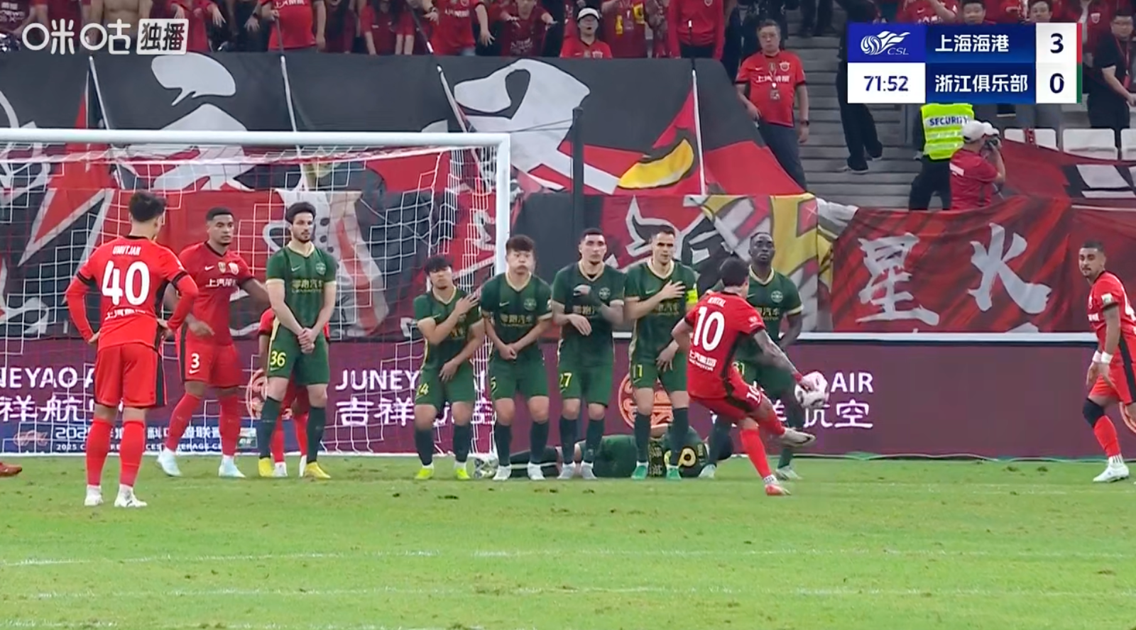 第72分钟,海港前场禁区外获得任意球机会,维塔尔直接射门将球打进球迷右上角死角,赵博极限扑救依然鞭长莫及,海港已经三球领先。