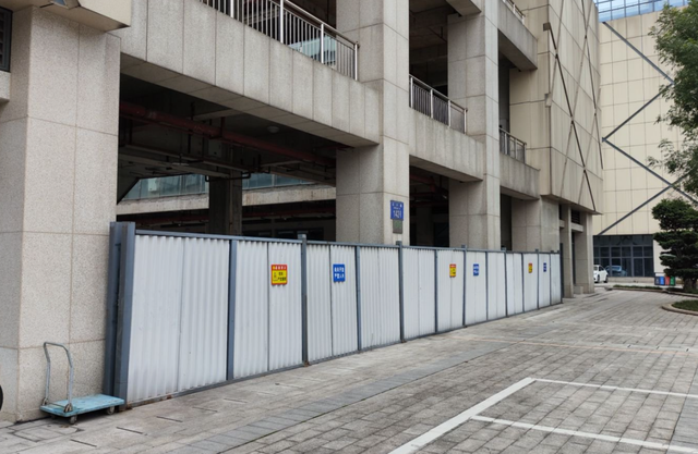 它的旁边是两栋巨大的类似商场的建筑,沿街所有的门面同样都是大门紧闭,几处通道入口还被围挡围住,根本无法进入。
