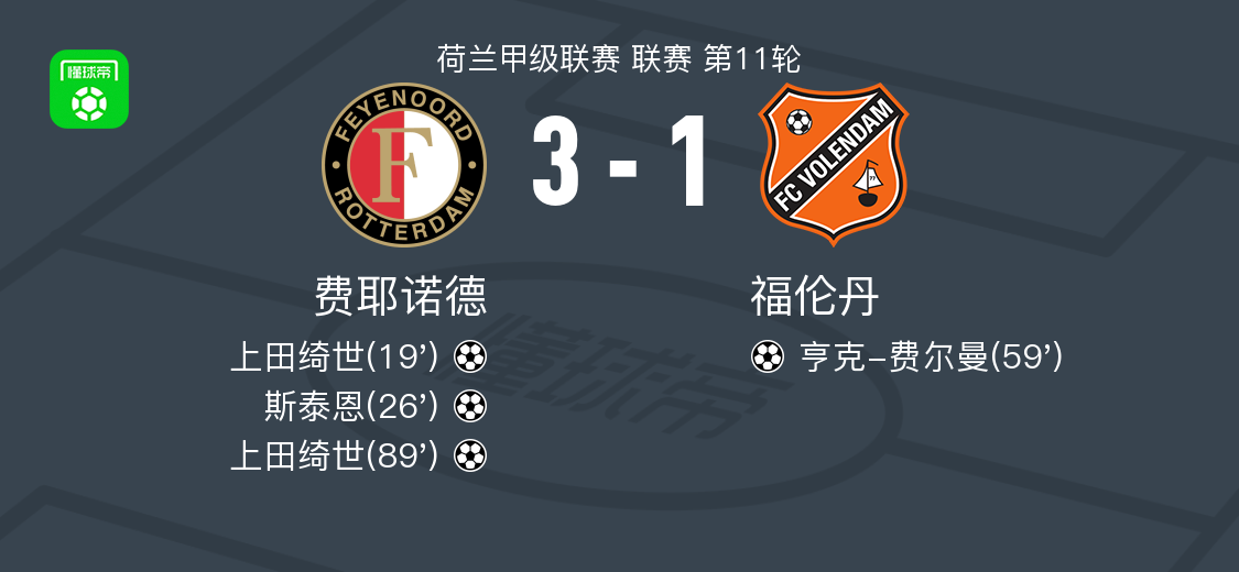 北京时间11月2日,荷兰甲级联赛第11轮迎来一场焦点对决,费耶诺德坐镇主场迎战福伦丹。凭借上田绮世的梅开二度以及斯泰恩的进球,费耶诺德以3-1的比分战胜对手,全取三分。福伦丹方面,亨克-费尔曼为球队打入一球。