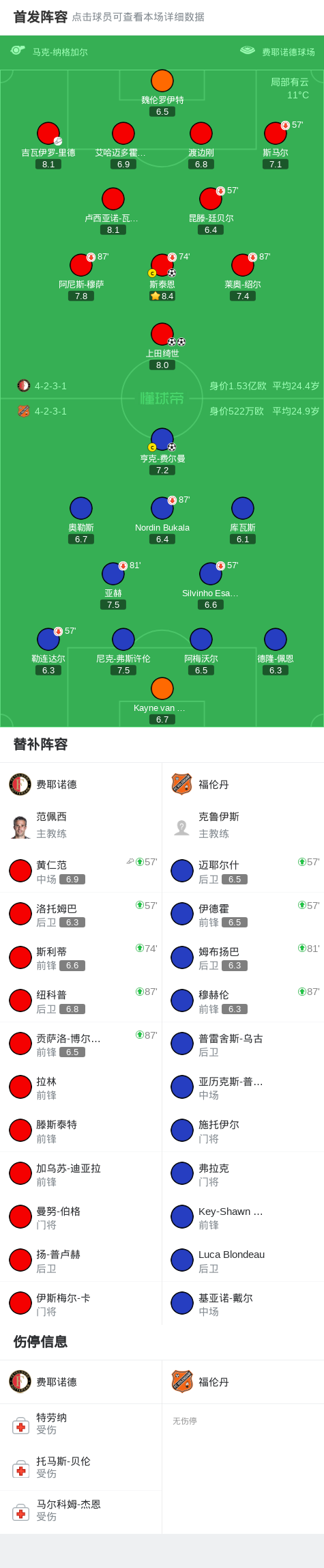 第89分钟,费耶诺德锁定胜局。黄仁范送出妙传,上田绮世再次展现射手本色,完成梅开二度,最终将比分定格在3-1。