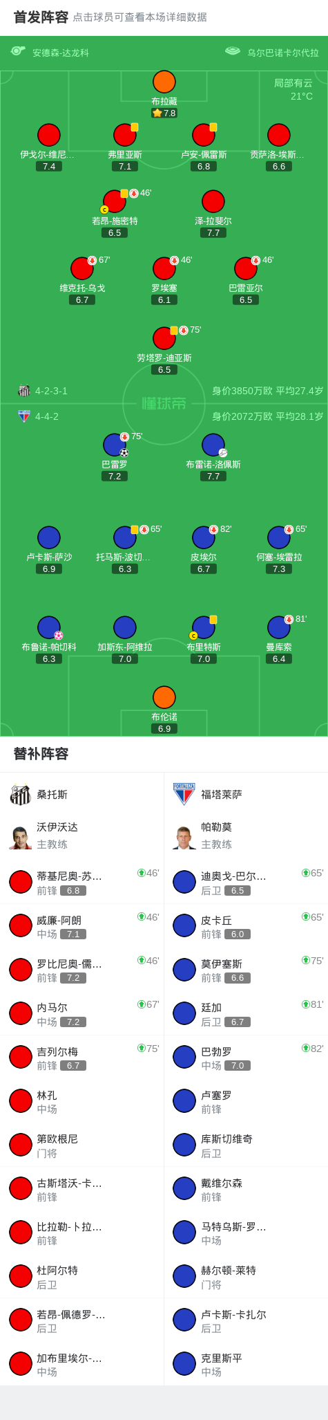 下半场第74分钟,场上形势发生戏剧性转折。桑托斯发起攻势,福塔莱萨后卫布鲁诺-帕切科在解围时不慎将球碰入自家大门,凭借这粒乌龙球,桑托斯顽强扳平比分,最终双方以1-1结束比赛。