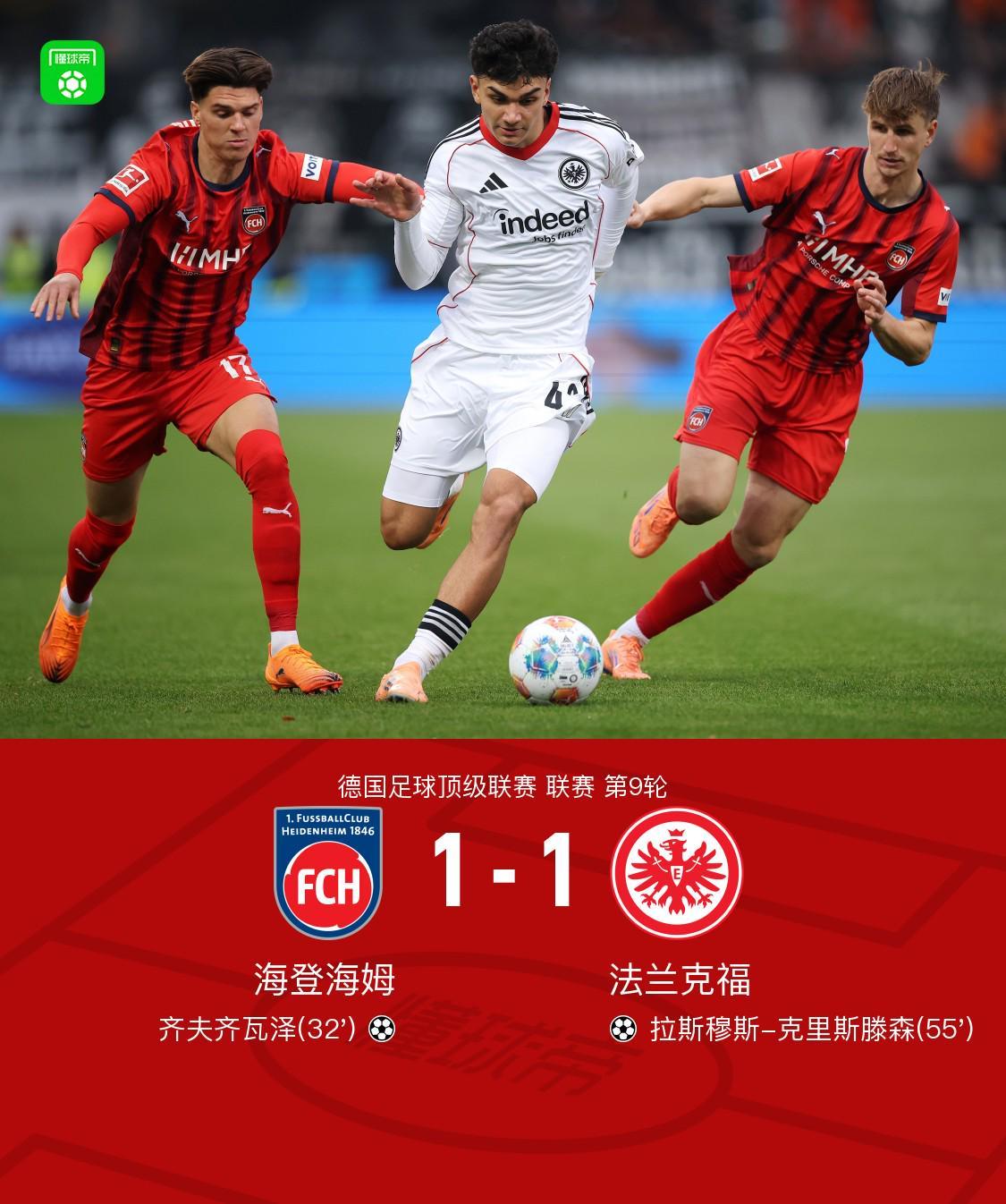北京时间11月1日,德国足球顶级联赛(德甲)第9轮迎来一场焦点战,海登海姆坐镇主场迎战法兰克福。上半场,阿尔扬-伊布送出精妙助攻,齐夫齐瓦泽抓住机会破门得分;下半场,布朗传中,克里斯滕森头球建功。最终,双方以1-1的比分握手言和。