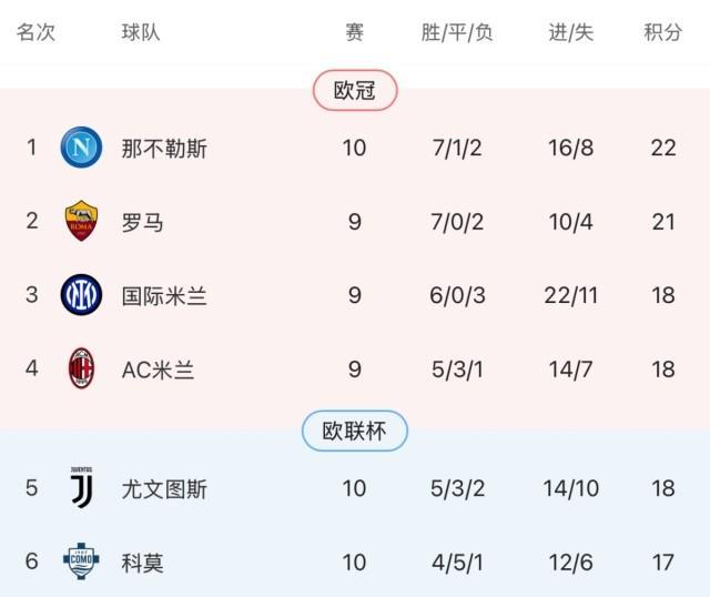 在意甲第10轮的一场焦点对决中,那不勒斯坐镇主场,与科莫展开了一场激烈的较量,最终双方0比0握手言和。此役过后,那不勒斯仅以1分的优势领先少赛一场的罗马,积分榜上的竞争愈发白热化。