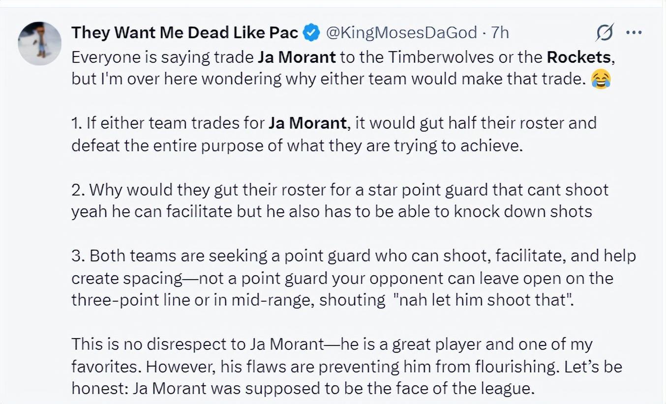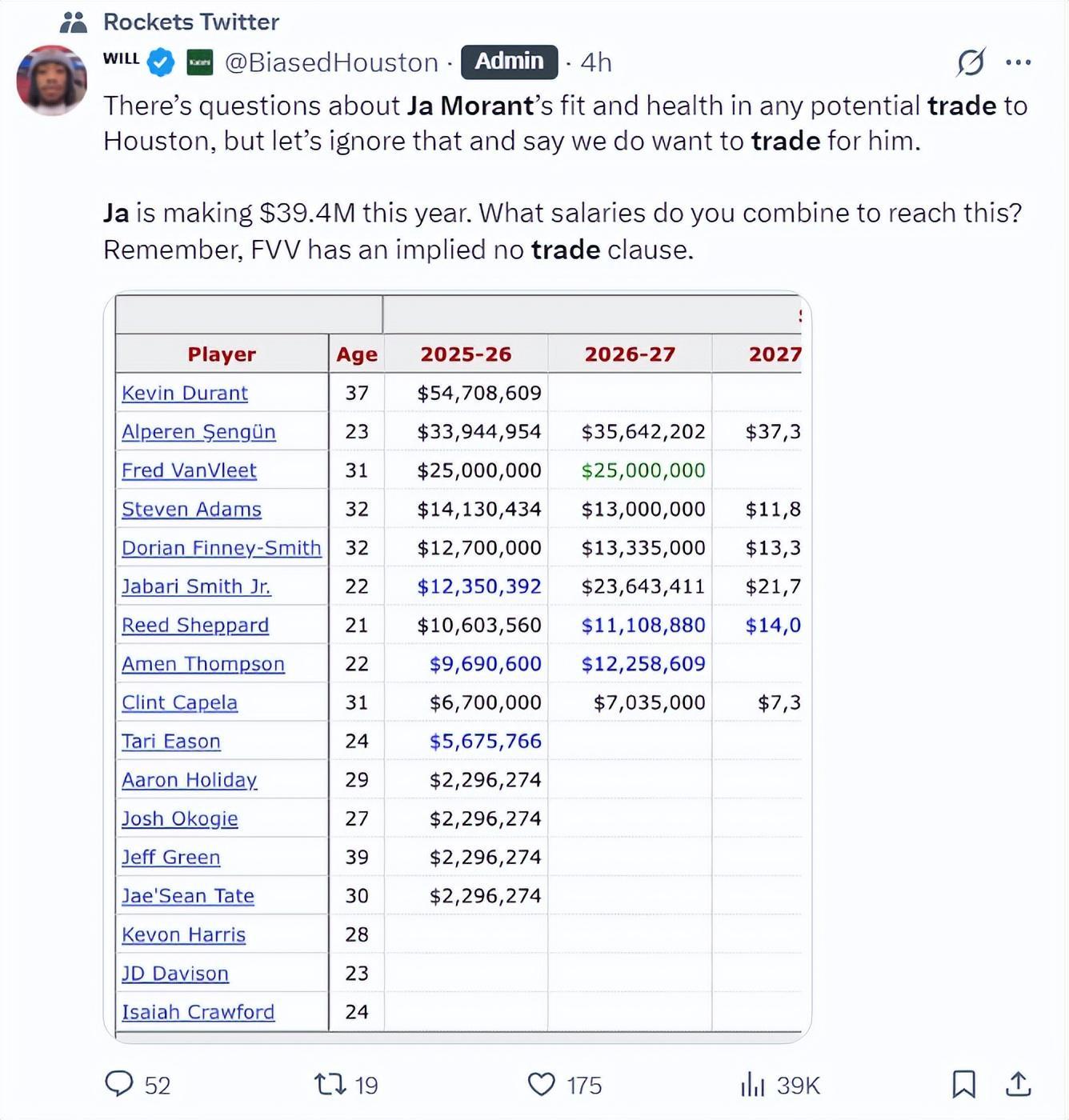 然而,休媒Biased Houston却为大家揭示了这笔交易的不可操作性。他们指出,在讨论莫兰特是否适合火箭队体系时,必须考虑到薪金空间的配平问题。莫兰特今年的合同高达3940万美元,要配平这样的薪金空间,火箭队需要送出哪位球员呢?更何况,范弗利特的合同中还隐藏了不可交易条款,这无疑增加了交易的难度。