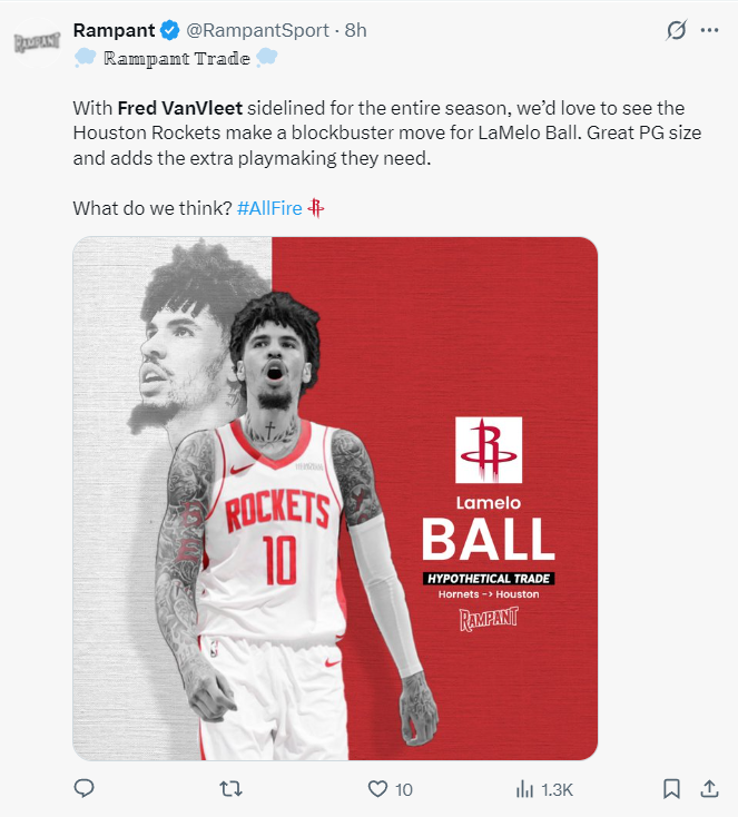 与此同时,另一家休斯顿媒体Tampant则提出了不同的建议。他们认为,鉴于范弗利特因伤整个赛季都无法登场,火箭队应该考虑交易得到黄蜂队的控卫拉梅洛-鲍尔,以增强球队的后场实力。
