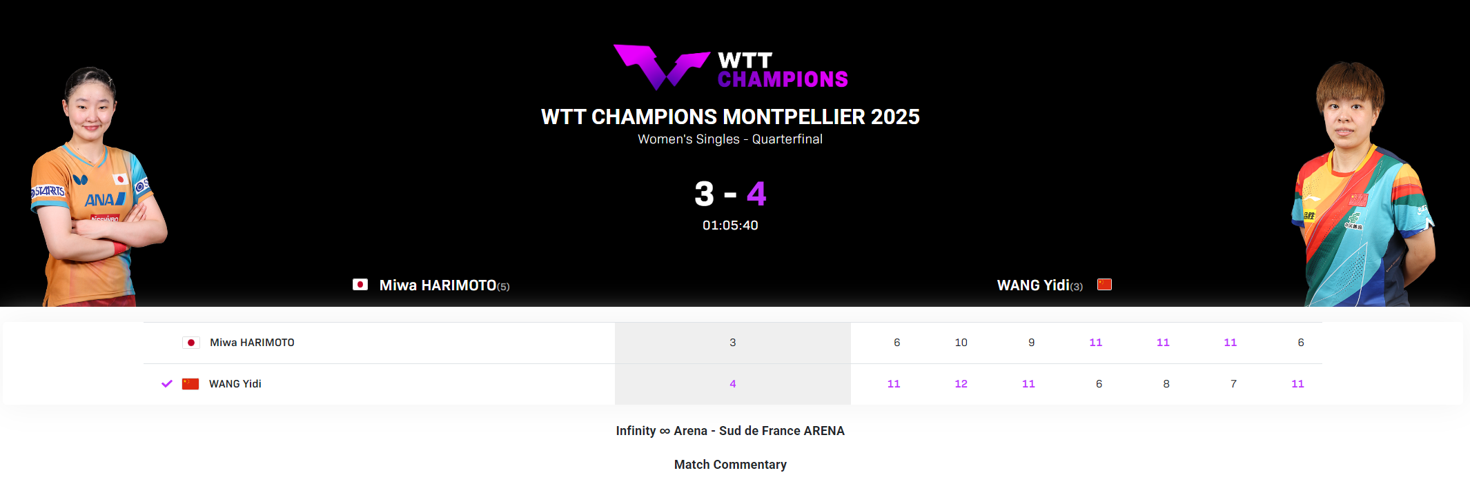 在2025年WTT蒙彼利埃冠军赛女单1/4决赛的激烈对决中,国乒选手王艺迪与日乒新星张本美和展开了一场扣人心弦的较量。最终,王艺迪以4-3的比分艰难击败张本美和,七局具体比分为:【11-6,12-10,11-9,6-11,8-11,7-11,11-6】。尤为引人注目的是,年仅17岁的张本美和在大比分0-3落后的不利局面下,展现出了惊人的韧性和斗志,连扳三局将比赛拖入决胜局,险些完成了让三追四的壮举。