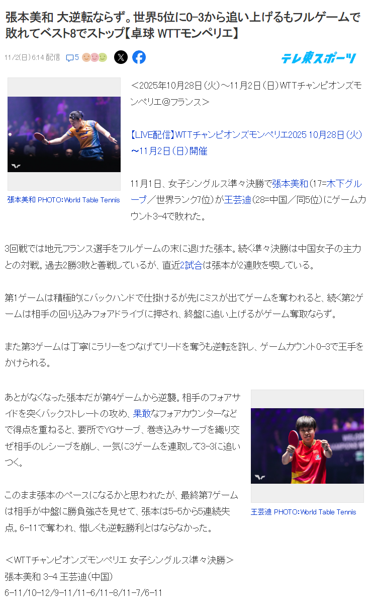 对于张本美和的出色表现,日媒《东京体育新闻》也给予了高度评价。他们盛赞这位17岁的小将在一度0-3落后的情况下险些完成了惊天逆转,并指出在之前的两次交手中张本美和还都击败了王艺迪。这样的评价无疑是对张本美和选手实力和潜力的最好肯定。