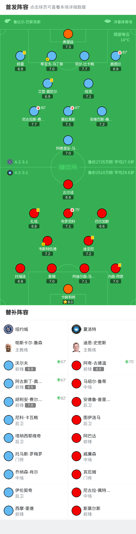 球队阵容方面,双方均派出了主力阵容出战。纽约城延续了其惯用的4-3-3阵型,而夏洛特则以4-2-3-1的阵型应对,试图通过中场控制来掌握比赛节奏。
