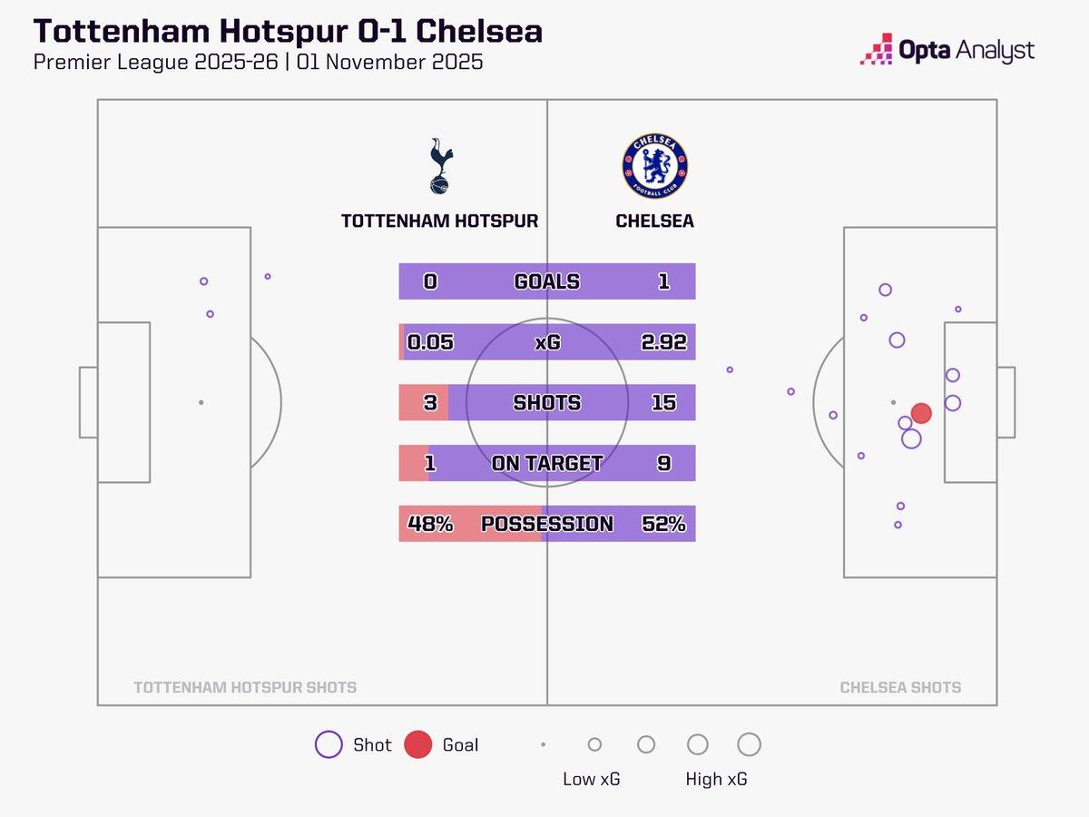 在英超第10轮的一场焦点对决中,热刺主场以0-1的比分不敌切尔西,遭遇了一场令人失望的失利。本场比赛,热刺的进攻表现极为低迷,全场仅完成了三次射门,而更为引人注目的是,他们的预期进球值(xG)竟然仅为0.05,这一数据创下了自2012-13赛季有统计以来,热刺在英超单场比赛中的最低预期进球值。
