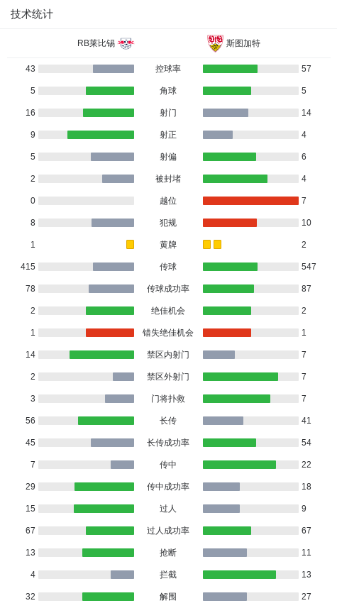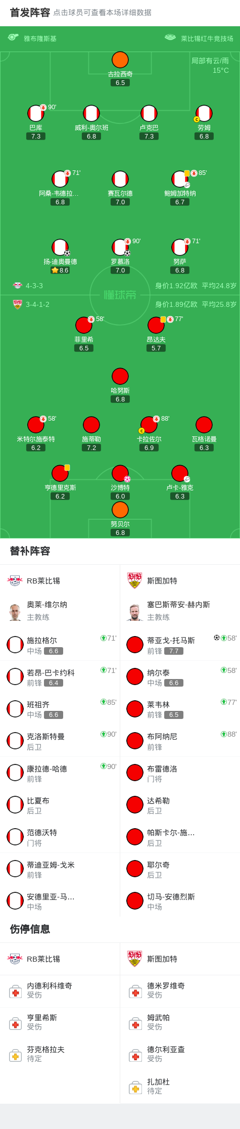 上半场临近结束时,斯图加特后卫沙博特在解围时不慎将球碰入自家球门,莱比锡凭借这粒意外之球取得领先。