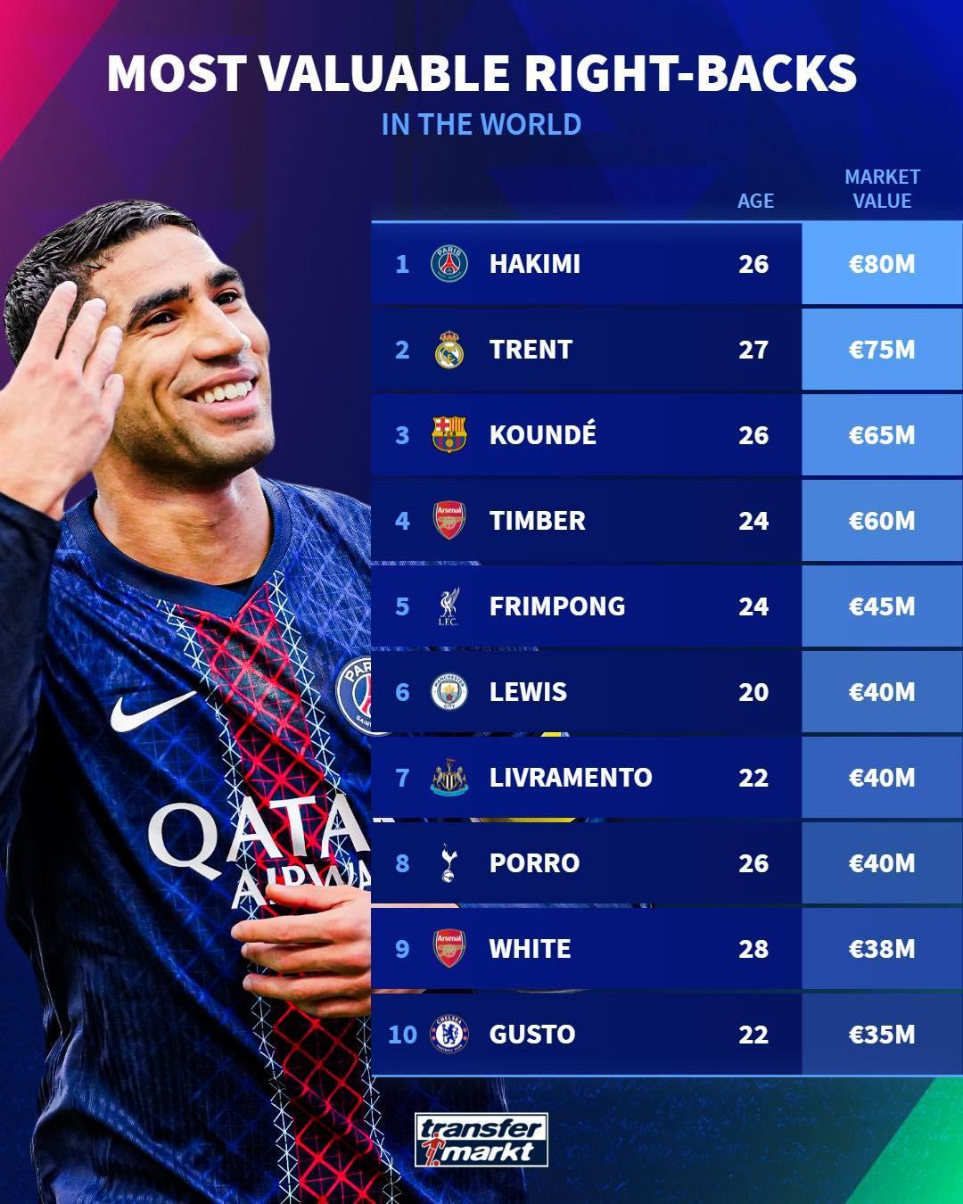 此次德转的更新再次凸显了右后卫位置在全球足坛的重要性,阿什拉夫和阿诺德作为当今足坛最贵的右后卫,他们的表现也备受球迷关注。