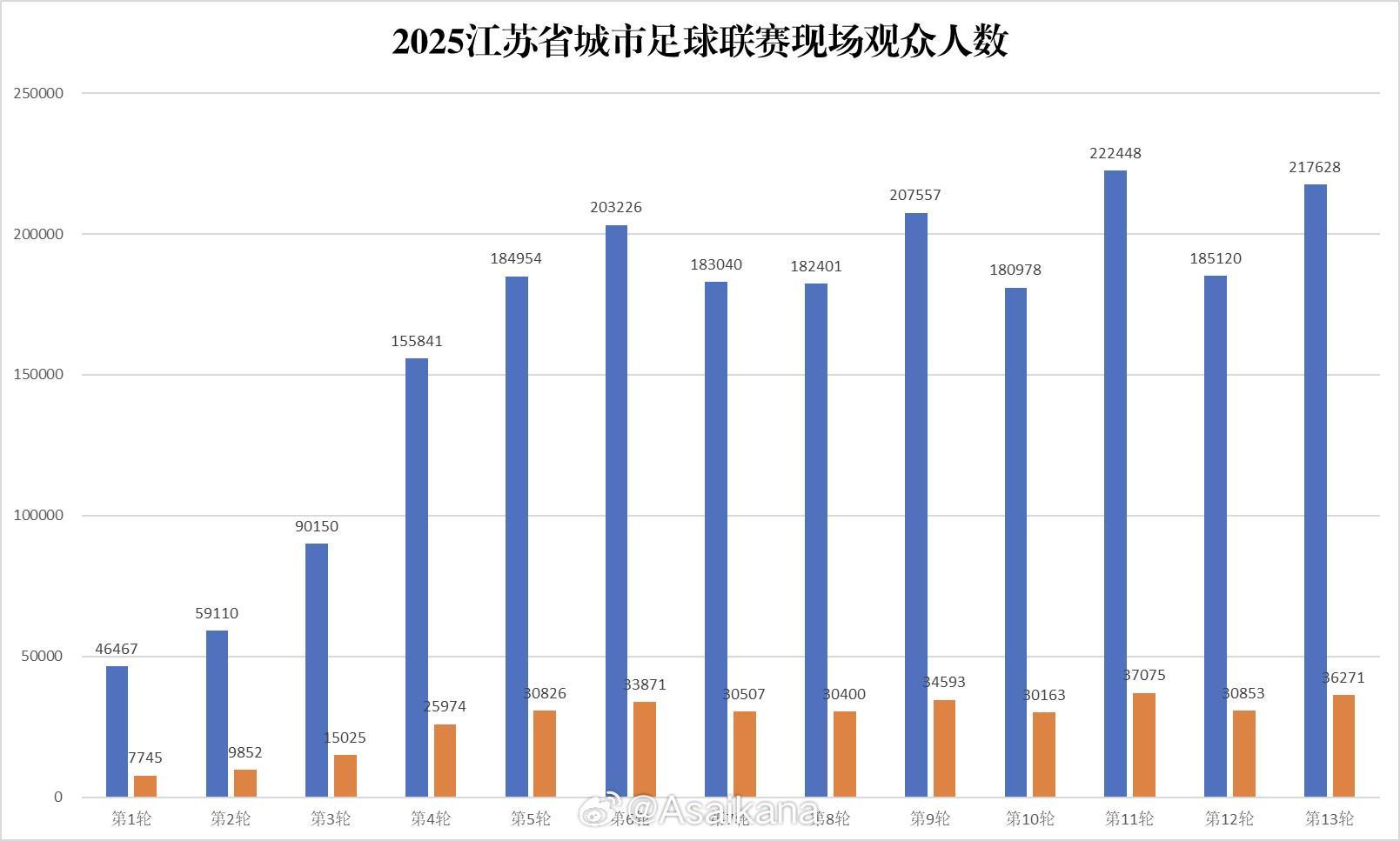 本届苏超联赛共进行了85场比赛,包括常规赛和淘汰赛两个阶段,总现场观众人数达到了2433339人次。其中,常规赛阶段,第十一轮的上座人数最高,达到了222448人次;第十三轮紧随其后,上座人数为217628人次;第九轮则以207557人次位列第三。