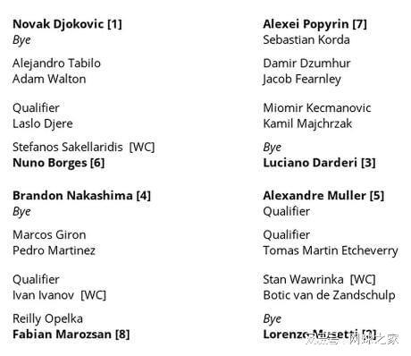 与德约科维奇同处上半区的种子球员还有毛洛桑、博尔赫斯和布兰登中岛。其中,匈牙利八号种子毛洛桑将在首轮对阵美国小巨人奥佩尔卡。而另一位塞尔维亚选手杰雷则有可能在第三轮与德约科维奇展开德比大战。