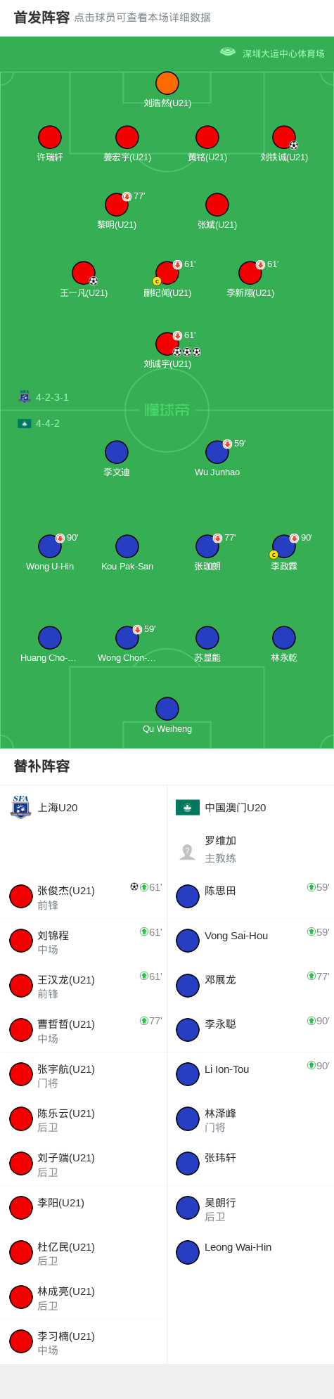 第20分钟,上海U20球员刘诚宇打入一球,为球队取得领先。