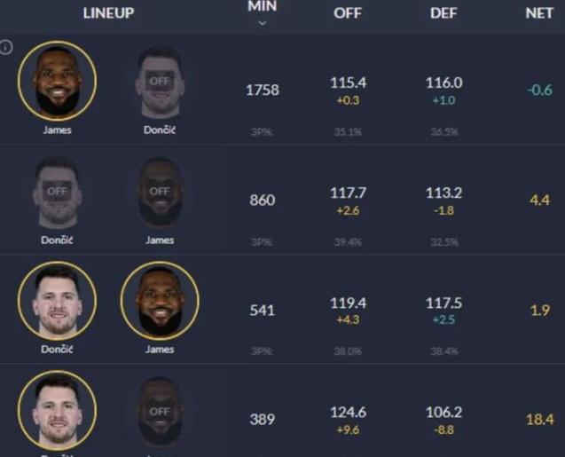 深入分析数据后,我们发现了一个有趣的现象:当詹姆斯和东契奇同时在场时,湖人队的净效率仅为1.9;而当詹姆斯单独在场时,这一数字竟下滑至-0.6;相反,东契奇单独在场时,球队的净效率高达18.4。这些数据无疑对皮尔斯关于詹姆斯与东契奇化学反应的看法提出了质疑,甚至暗示詹姆斯的存在可能在一定程度上影响了球队的整体表现。