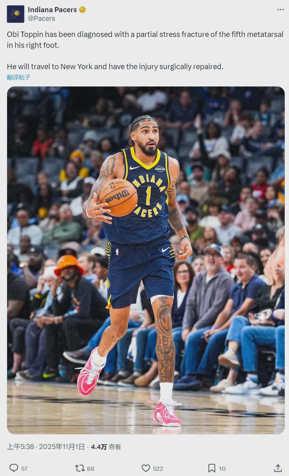 根据步行者官方公告,托平已暂时离队前往纽约接受治疗,右脚将被植入螺丝固定,预计三个月后重新评估。这意味着他至少将缺席至明年2月,而步行者目前半个轮换阵容已伤完:哈利伯顿跟腱撕裂、马瑟林右脚大拇指受伤、麦康奈尔腿筋拉伤、内姆哈德左肩拉伤……本场比赛伤病名单多达7人,创下本赛季NBA单场伤病人数纪录。
