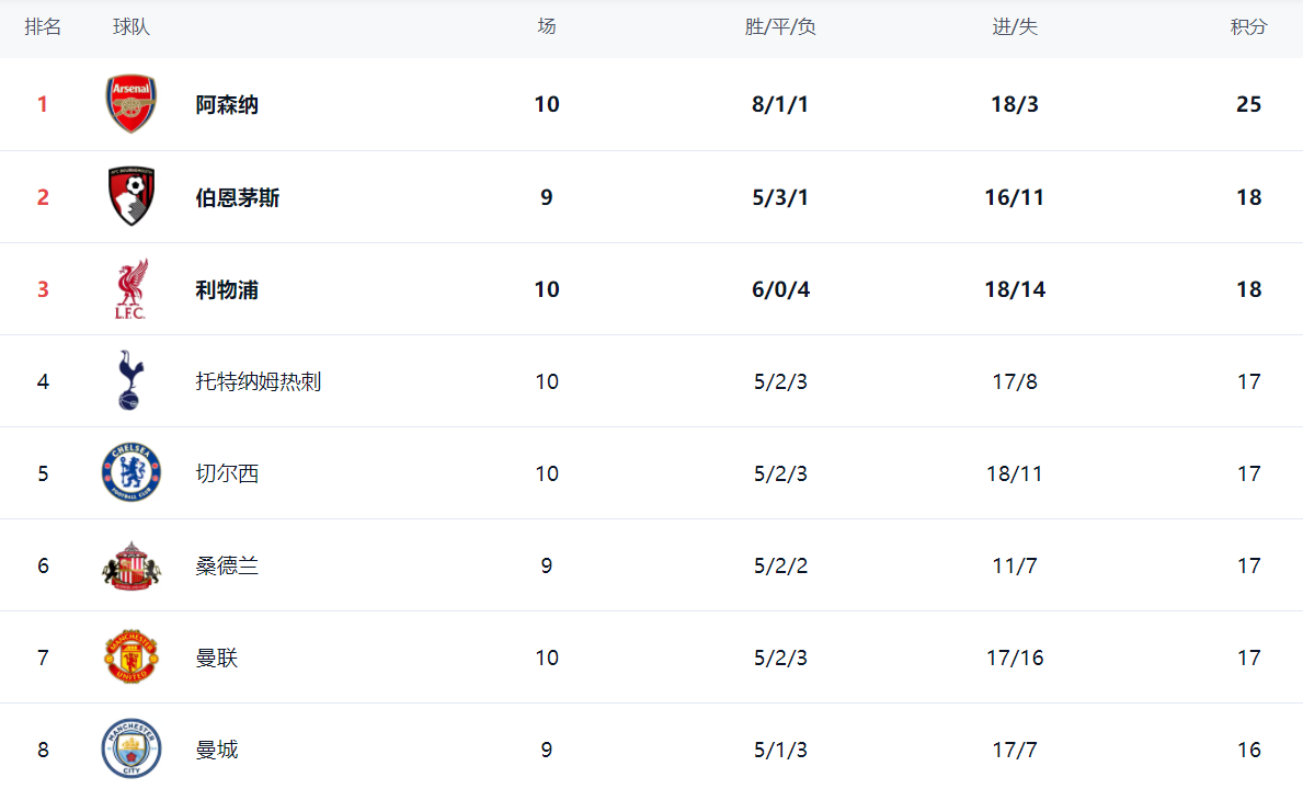 积分榜呈现戏剧性局面:阿森纳以25分独占鳌头,伯恩茅斯与利物浦同积18分分列二三位,热刺、切尔西、桑德兰和曼联四支球队均积17分形成第二集团,曼城9轮16分暂居第八。随着赛程深入,本赛季英超冠军争夺与欧战资格竞争已进入白热化阶段。