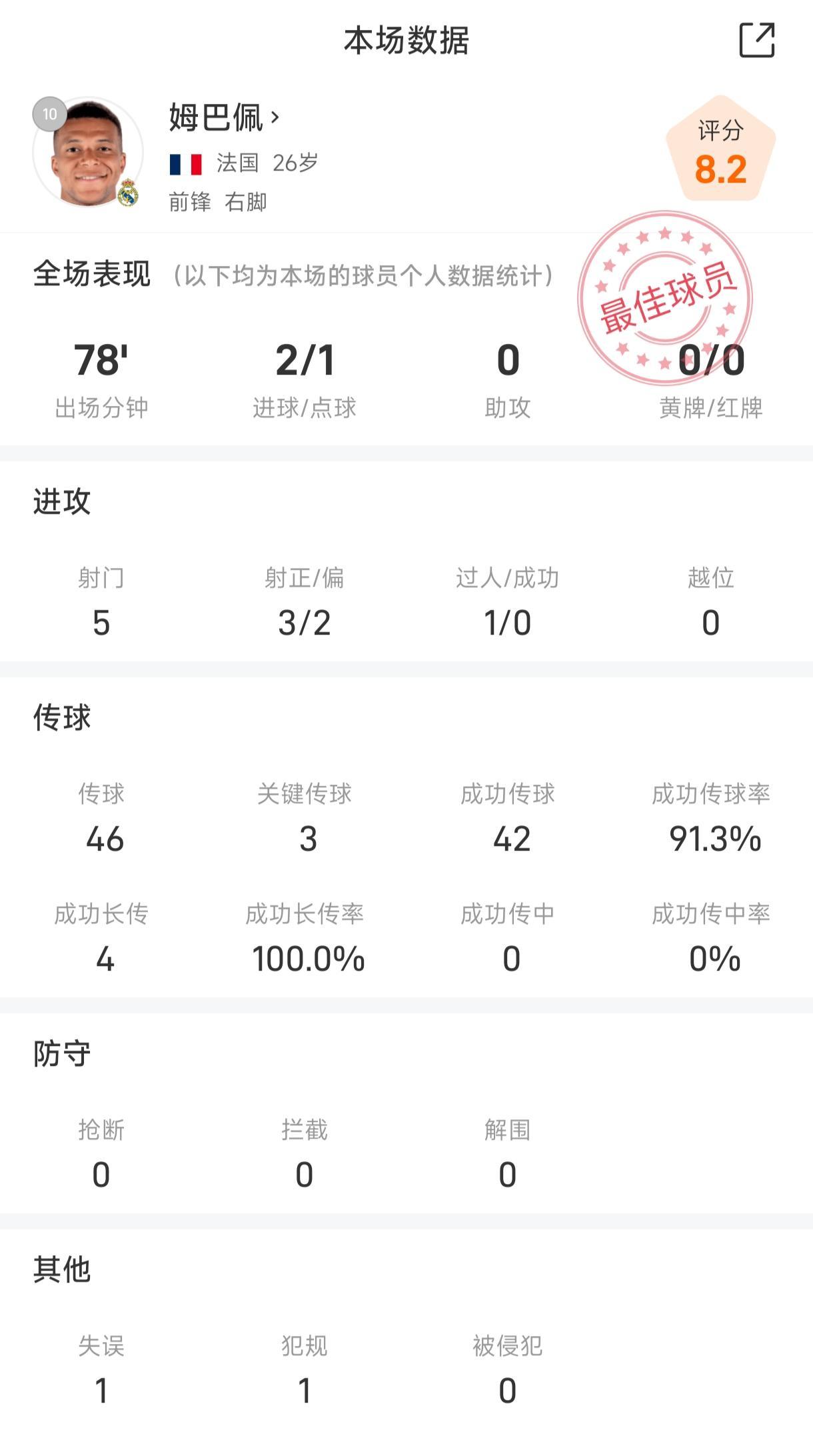 第19分钟:姆巴佩主罚点球冷静低射左下角,皮球直窜网窝,帮助皇马率先打破僵局。