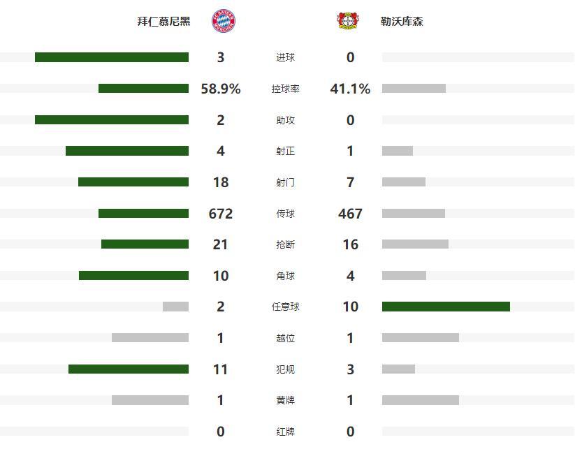 尽管接下来的时间内,拜仁未能进一步改写比分,但他们在防守端也没有给勒沃库森任何机会,如愿以偿在安联球场零封对手,终结药厂德甲客场不败纪录,同时也将自己保持的德甲开赛连胜纪录扩大到15场。