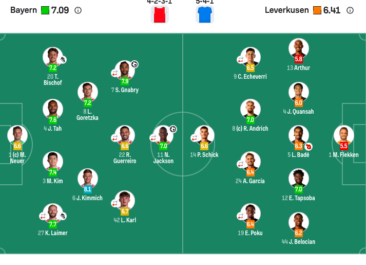 拜仁首发:1-诺伊尔、4-塔、3-金玟哉、22-格雷罗(79’45-帕夫洛维奇)、20-比朔夫、27-莱默尔(75’23-博伊)、8-格雷茨卡、6-基米希、7-格纳布里(60’17-奥利塞)、42-伦纳特·卡尔(60’14-迪亚斯)、11-杰克逊(60’9-凯恩)。