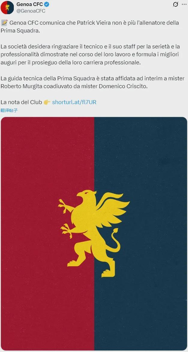官方消息,热那亚宣布解雇了主帅维埃拉。本赛季热那亚在9场意甲比赛中未尝一胜,只取得了3平6负的战绩。