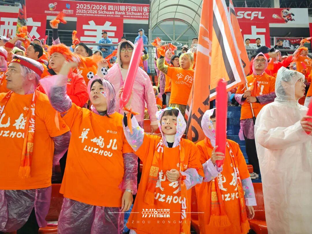 尽管天空飘着细雨,气温微凉,但体育公园的看台上依然汇聚了来自两地的球迷。“泸州!雄起!”的呐喊声震彻雨夜,带着橙色泡面头的孩子们格外显眼,稚嫩的眼中映照着绿茵场上的拼搏身影,也映照着对足球最纯真的热爱。