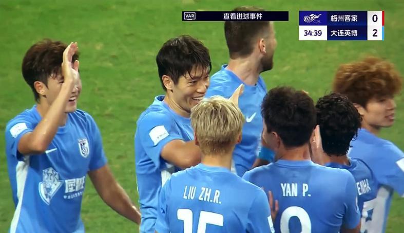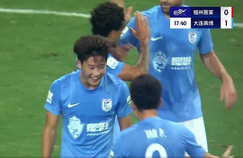 上半场,大连英博虽然多名主力伤缺,但残阵出战的他们却反客为主,展现出强大的战斗力。第18分钟,廖锦涛分右路,杨铭锐右扣过防守后一记低射破门,为大连英博先拔头筹,这也是小将杨铭锐代表英博队斩获的处子球。随后,毕津浩再下一城,上半场梅州客家0-2落后,形势岌岌可危。