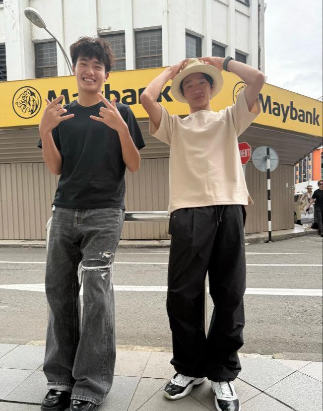 看照片里的Joe,穿了件简约黑色短袖,头发烫成微微卷度,阳光洒在脸上,笑起来眼睛眯成缝,露出洁白牙齿,活脱脱一个元气满满的阳光大男孩;再看旁边的杨阳洋,戴着黑色棒球帽,偷偷蹲在桌子后面,只露出半个身子,硬是跟站着的Joe拍出张“错位神图”——从镜头角度看,就像Joe身边凭空多了个“小矮人”,不知道的还以为他要钻进桌子底下躲镜头呢。16岁的小伙子面对镜头还是会害羞,被Joe逗笑时,脸憋得通红,耳朵尖泛着粉色,这反差萌太可爱了!
