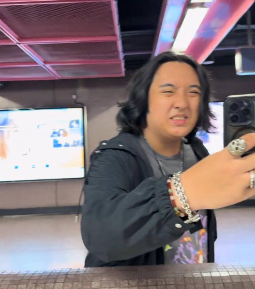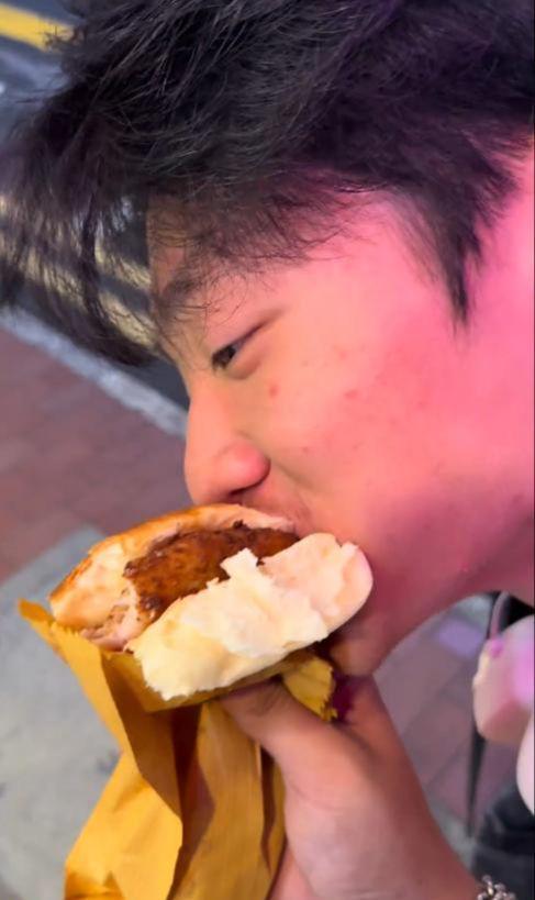 其实费曼的状态早就引发过网友的关注了。前段时间有网友在香港的街头小吃摊偶遇他,当时已经是傍晚,路灯昏黄地照在他身上,他穿着一件宽松的黑色外套,独自站在摊位前买鱼蛋。照片里的他脸色暗沉得像好几天没睡好,黑眼圈重得能当眼影用,一头长发油腻地粘在头皮上,发尾还微微打结,整个人看起来没什么精神,蔫蔫的提不起劲儿。有路人跟他打招呼并提出合照,他虽然配合地比了个耶,但眼神里却少了少年人该有的活泼灵动,多了几分挥之不去的疲惫,跟旁边摊位前蹦蹦跳跳、吵着要吃零食的小朋友形成了鲜明对比。