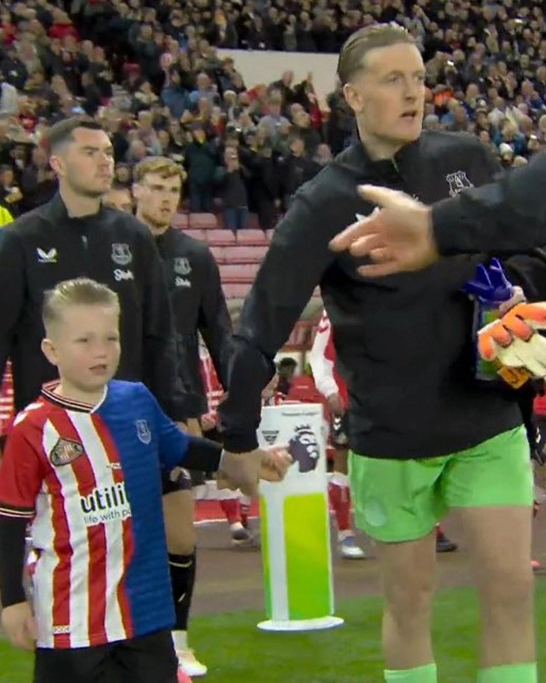 本场比赛赛前,一个温馨的画面吸引了全场目光——埃弗顿门将皮克福德特意安排自己的儿子担任球童。当皮克福德牵着儿子的手步入球场时,小家伙身上那件别具一格的球衣瞬间成为焦点:这件球衣巧妙地将埃弗顿与桑德兰的队服元素拼接在一起,象征着父亲与两支球队的深厚渊源。