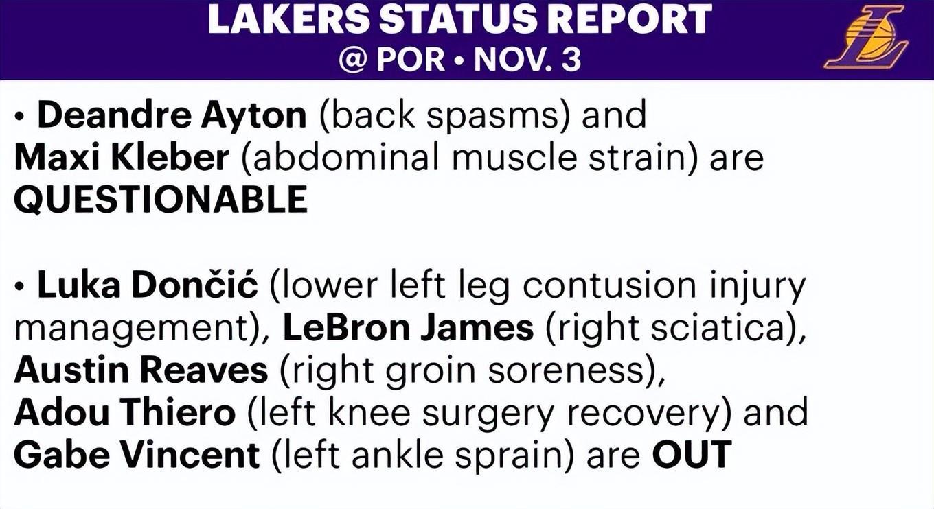 根据湖人队官方公布的伤病报告,本场比赛共有5名球员确定无法出战,另有2人状态为“出战成疑”。具体名单如下: