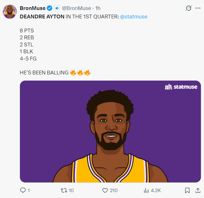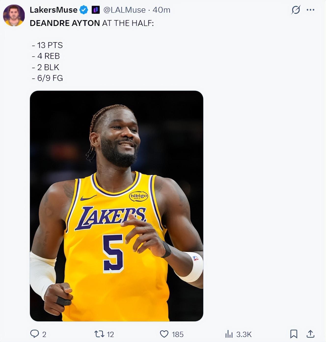 第三节成为艾顿的“个人表演时刻”:他单节6投4中再取8分3篮板,三节战罢15投10中,以66.7%的命中率砍下21分7篮板1助攻2盖帽。湖人媒体直言:“每当艾顿出手,我就觉得球一定会进,他今晚的状态太火热了!”由于背靠背首战轮休,艾顿此役体能充沛,在禁区的终结效率堪称恐怖。