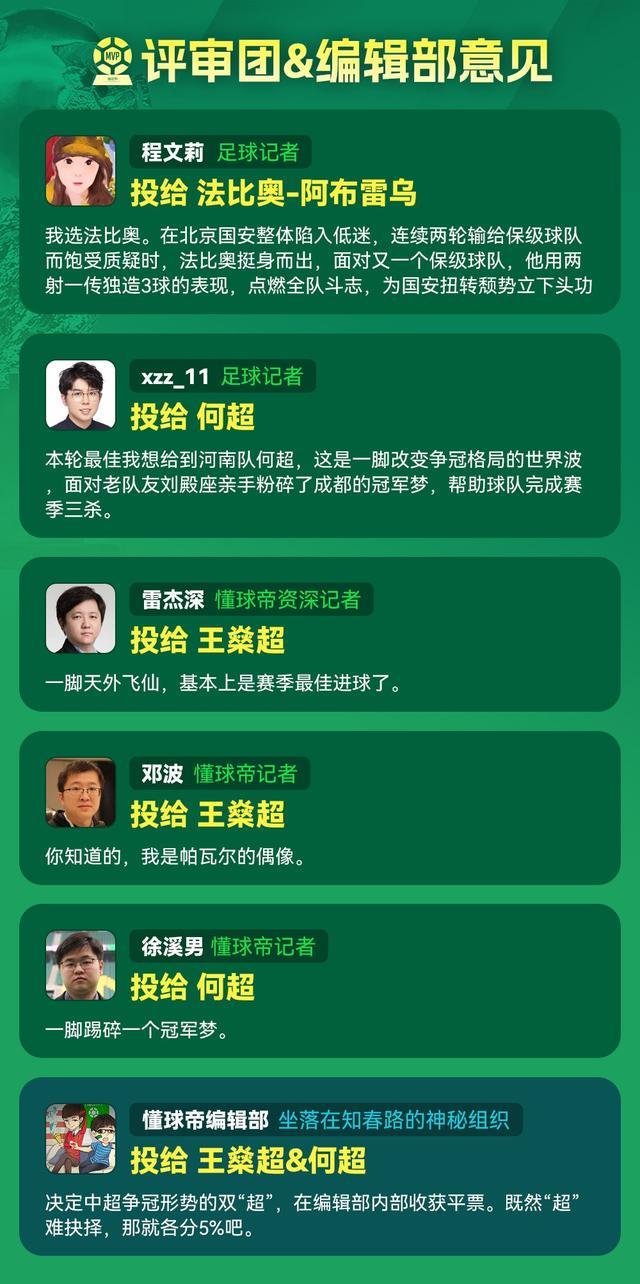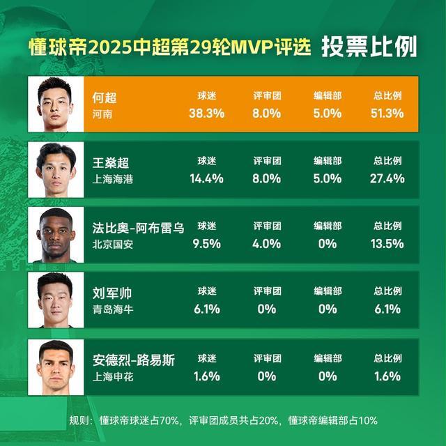 最终,经过球迷投票、评审团投票以及编辑部投票三部分的综合统计,何超以51.3%的得票率脱颖而出,成功当选本轮中超MVP。他的这一表现无疑为河南队本赛季的征程增添了浓墨重彩的一笔。