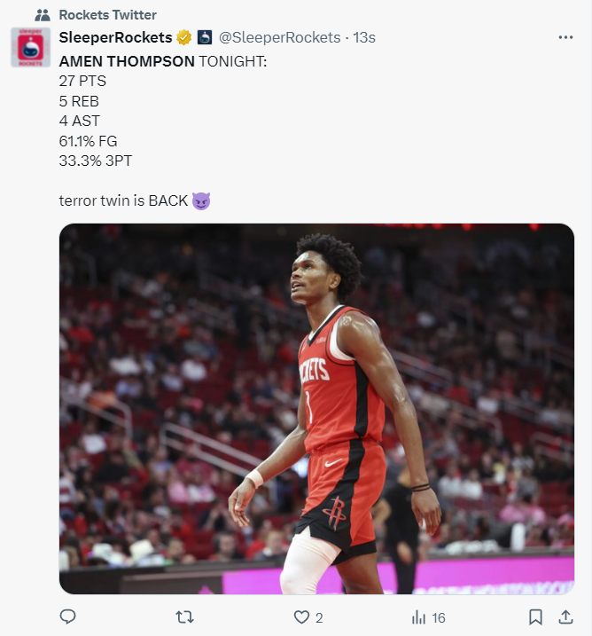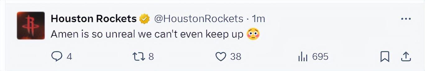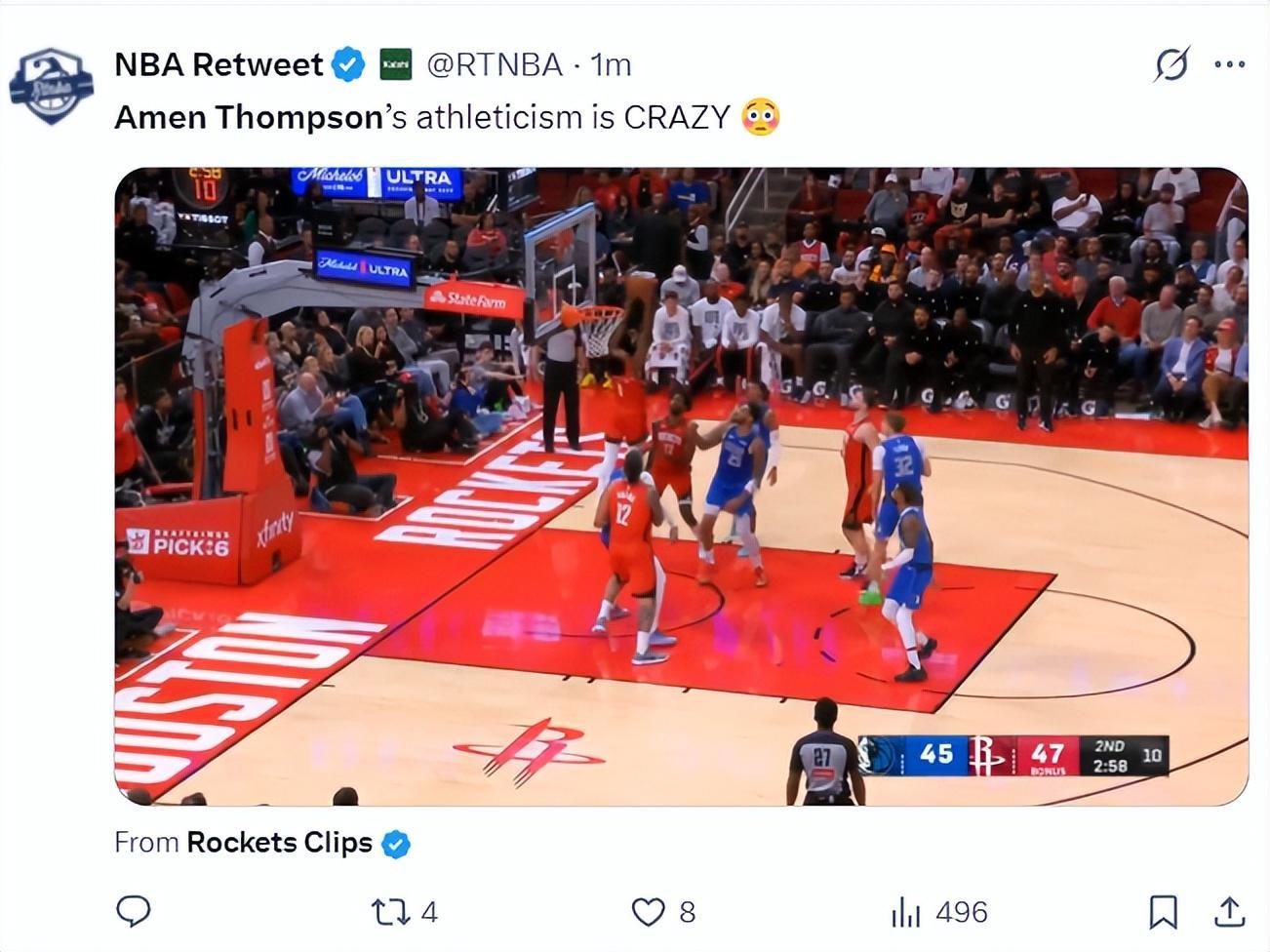 紧接着的回合,独行侠出现失误,杜兰特持球快攻时再次为阿门送出空接助攻。阿门双手暴扣炸框,连续两个高难度扣篮彻底点燃丰田中心球馆的气氛。火箭官方社交媒体激动发文:“阿门的表现太不真实了,我甚至跟不上他的节奏!”半场结束时,阿门已经贡献20分4篮板4助攻1抢断,成为球队得分王。
