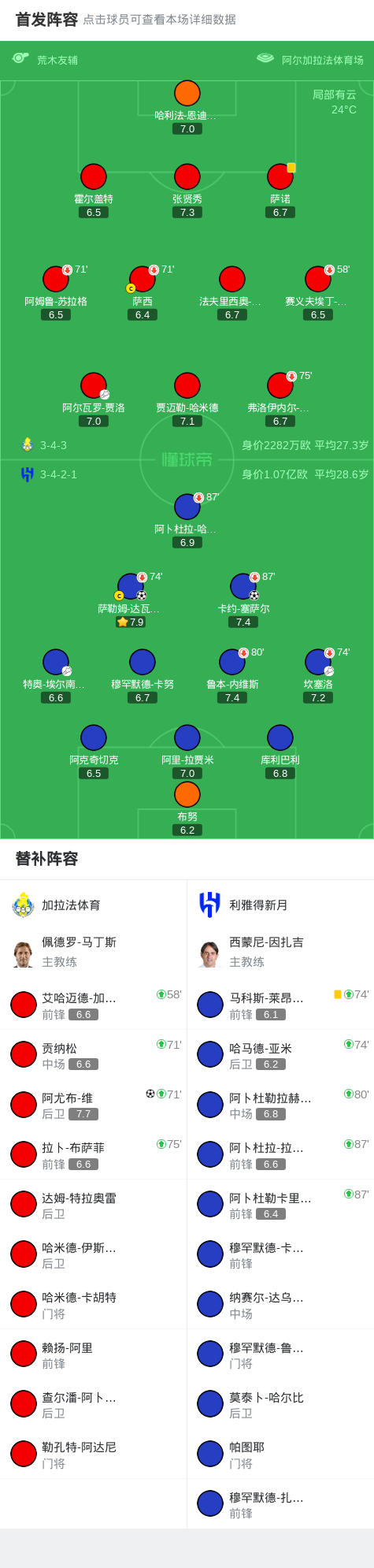 尽管两球落后,但加拉法体育并未放弃。下半场补时第8分钟,加拉法体育球员阿尔瓦罗-贾洛在左路突破后送出横传,阿尤布-维门前抢点破门,为加拉法体育扳回一城。然而,时间所剩无几,最终利雅得新月以2-1的比分赢得比赛。