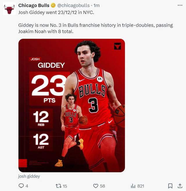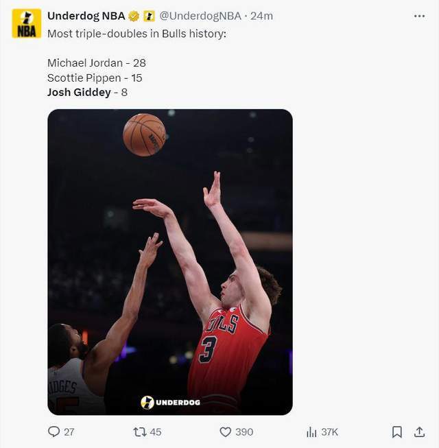 此外,凭借这场比赛,吉迪还成为公牛队史上第二位至少拿到两次20+三双的球员,排在他前面的仅有乔丹一人。