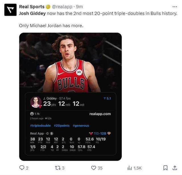 23+12+12,这是吉迪本赛季的第一个三双,也是公牛队史的第一个三双,更是他职业生涯的第19次三双。在公牛生涯中,他已经8次砍下三双,超越了前辈乔金·诺阿,升至队史第三,仅次于皮蓬和乔丹。