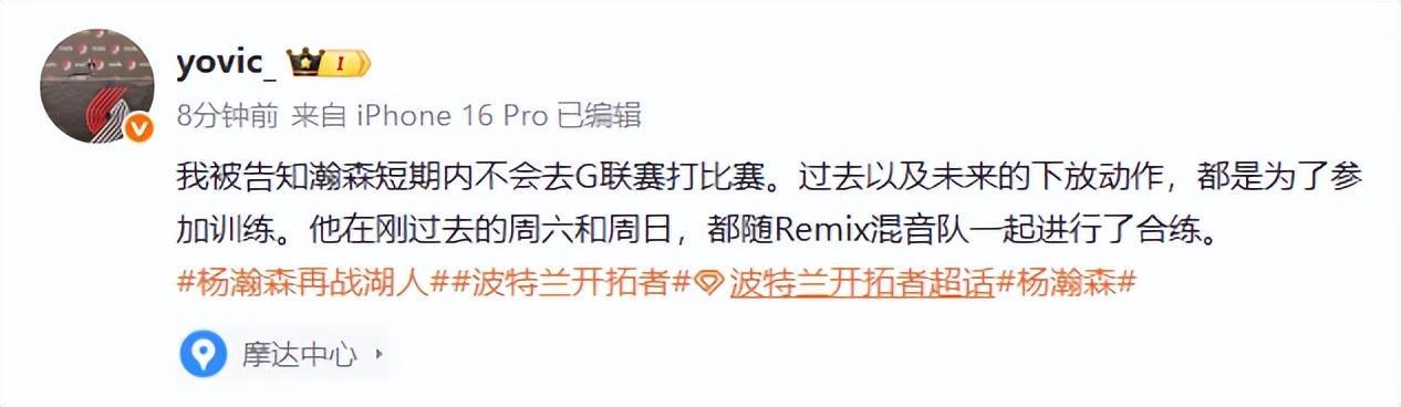 11月4日,据开拓者队随队记者yovic的最新报道,中国球员杨瀚森的职业生涯规划有了新的动态。这一消息对于关注杨瀚森的球迷和篮球界人士来说,无疑是一个重要的信息点。