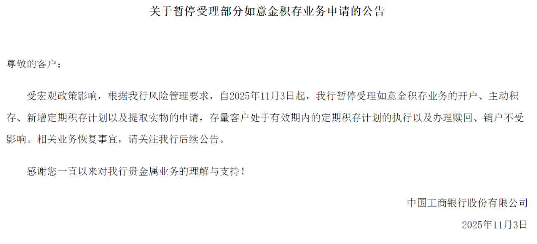 据悉,自11月1日起,工行已暂停积存金提取实物金条服务,具体恢复时间待定。同时,积存金开户、主动积存及新增定期积存计划也一并暂停。这一系列举措,让不少投资者措手不及。